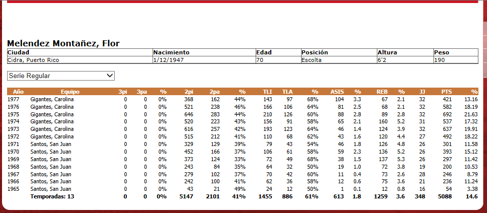 Concluyó su carrera como uno de 79 jugadores en la historia del BSN que han anotado 5,000 puntos o más (5,088), según destacó el reconocido exdirector de la liga juvenil y estadístico Francisco “Paquito” Rodríguez.