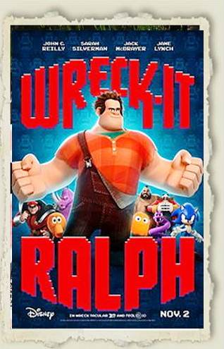 114. Wreck-It Ralph (Mónica Lago-Kaytis, John Lasseter, Clark Spencer & Walt Disney Animation Studios, 2012, Hollywood, PG). Género: comedia de aventuras con dibujos animados. Fecha de estreno en Puerto Rico: noviembre 2. Fotografía: Max Hanley y Julio Macat. Guionistas: Phil Johnson y Jennifer Lee. Editor: William J. Caparella. Actores que aportaron sus voces a los personajes: John C. Reilly («Wreck-It Ralph»); Jack McBrayer («Fix-It Felix»); Adam Carolla («Wynchell»); Jamie Elman («Rancis Flugerdutter»); Rachael Harris («Deana»); Dennis Haysbert («General Hologram»); Mindy Kaling («Taffyta Muttonfudge»); Kyle Hebert («Ryu»); Reuben Langdon («Ken»); Charles Martinet («Mario» y «Luigi»); Edie McClurg («Mary»); Ed O’Neill («Mister Litwak»); Gerald C. Rivers («M. Bison»); Horatio Sanz («Duncan»); Brandon Scott («Kohut»); Stefanie Scott («Moppet Girl»); Sara Silverman («Vanellope von Schweetz»); Skrillex («DJ»); Roger Craig Smith («Sonic the Hedgehog») y Alan Tydyk («King Candy»). Banda sonora: Henry Jackson.Duración: 108 minutos.