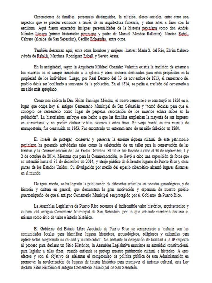 “Preservar el antiguo cementerio es preservar la memoria de la realidad social y económica de un pueblo del interior de la Isla, donde el desarrollo económico tardío -respecto a la costa azucarera-, basado en la industria del café, le permitió unirse a la marcha de la “civilización” y la “cultura”. En cada uno de sus panteones pueden identificarse las familias que más se beneficiaron de la época dorada del café en Puerto Rico (1870-1898) y cuyos apellidos todavía eran reconocidos por la población un siglo después. La mayor parte de esas familias pueden trazar su ascendencia a la llegada de un español al pueblo en el siglo 19”.